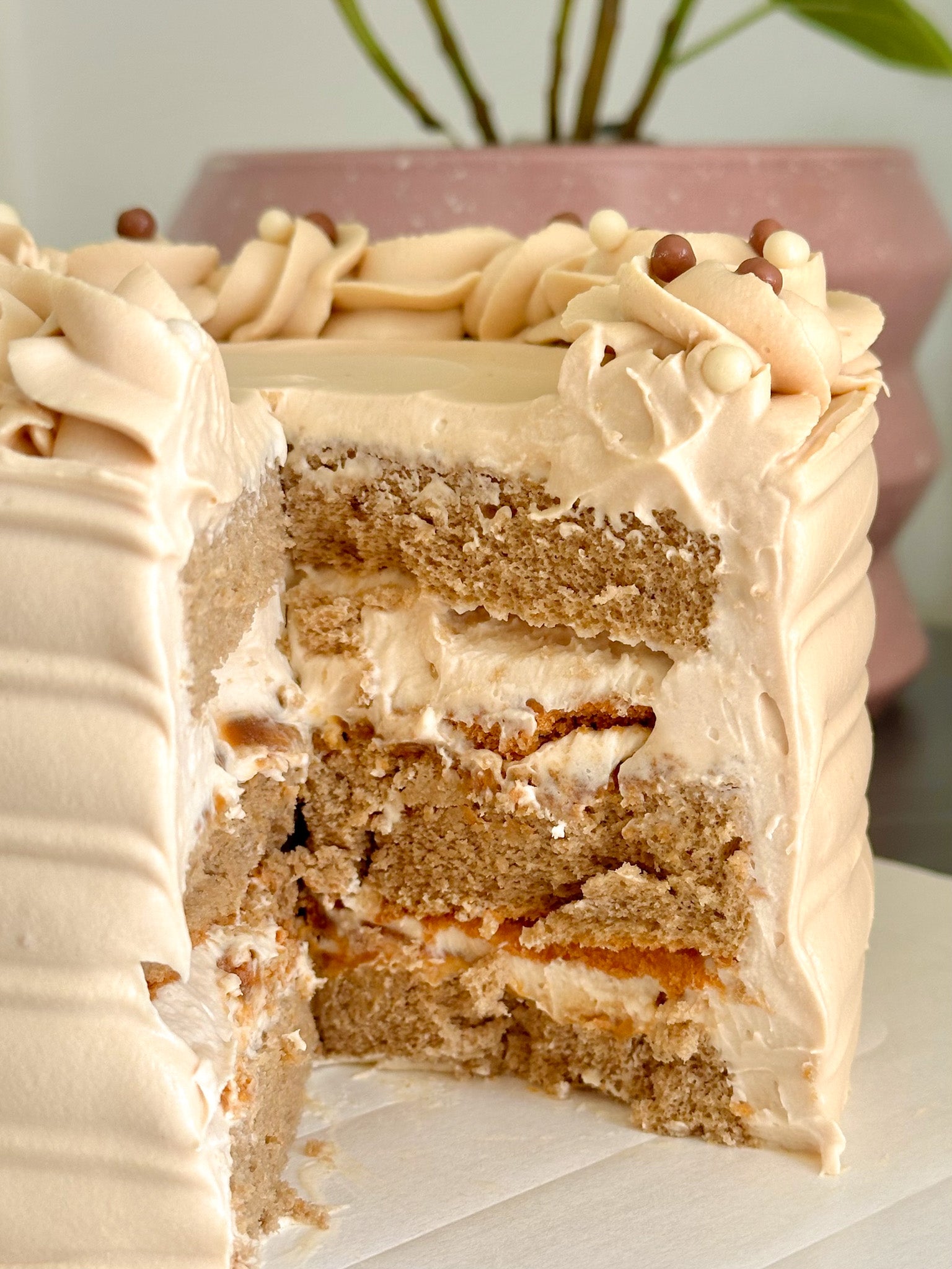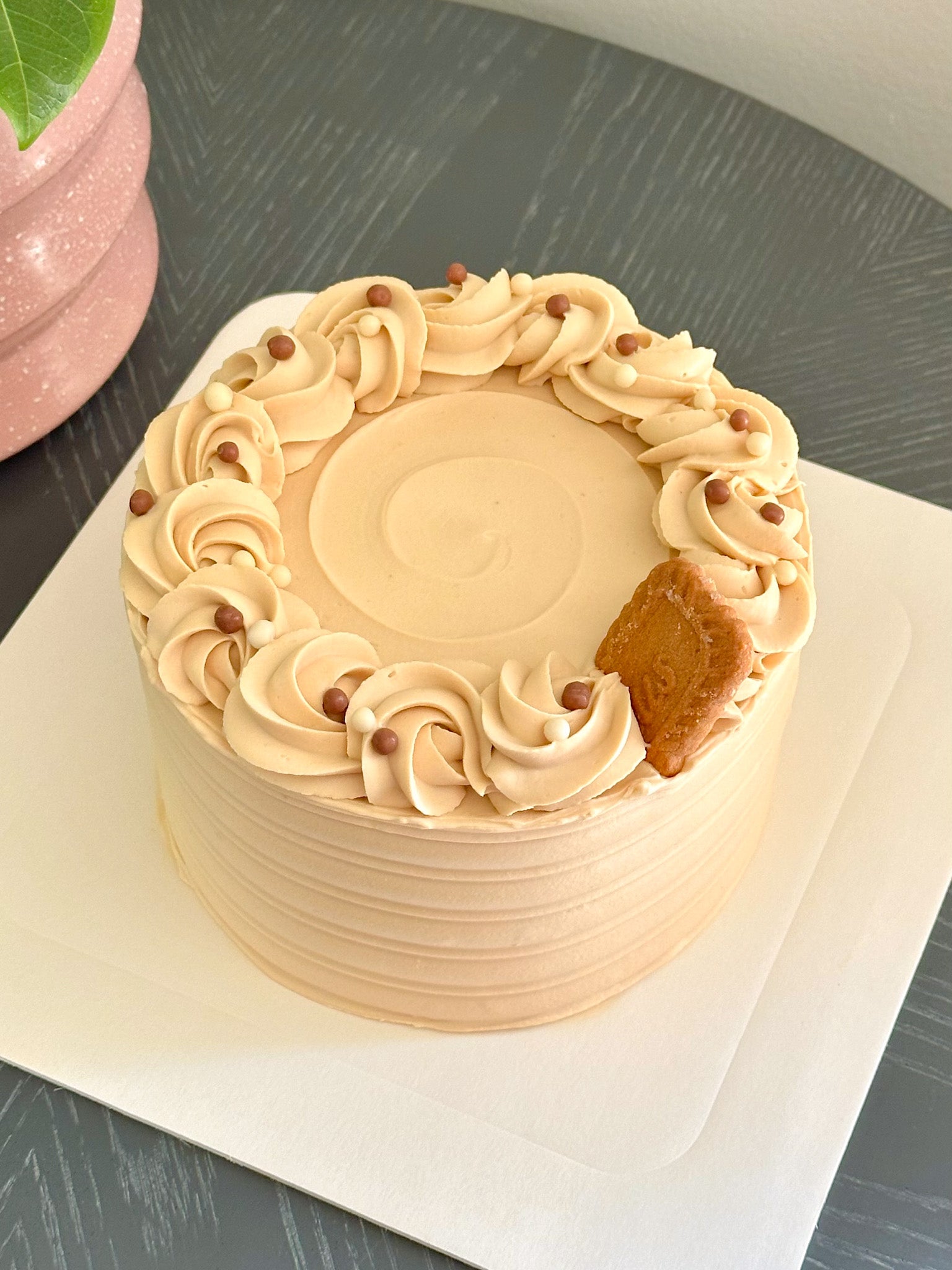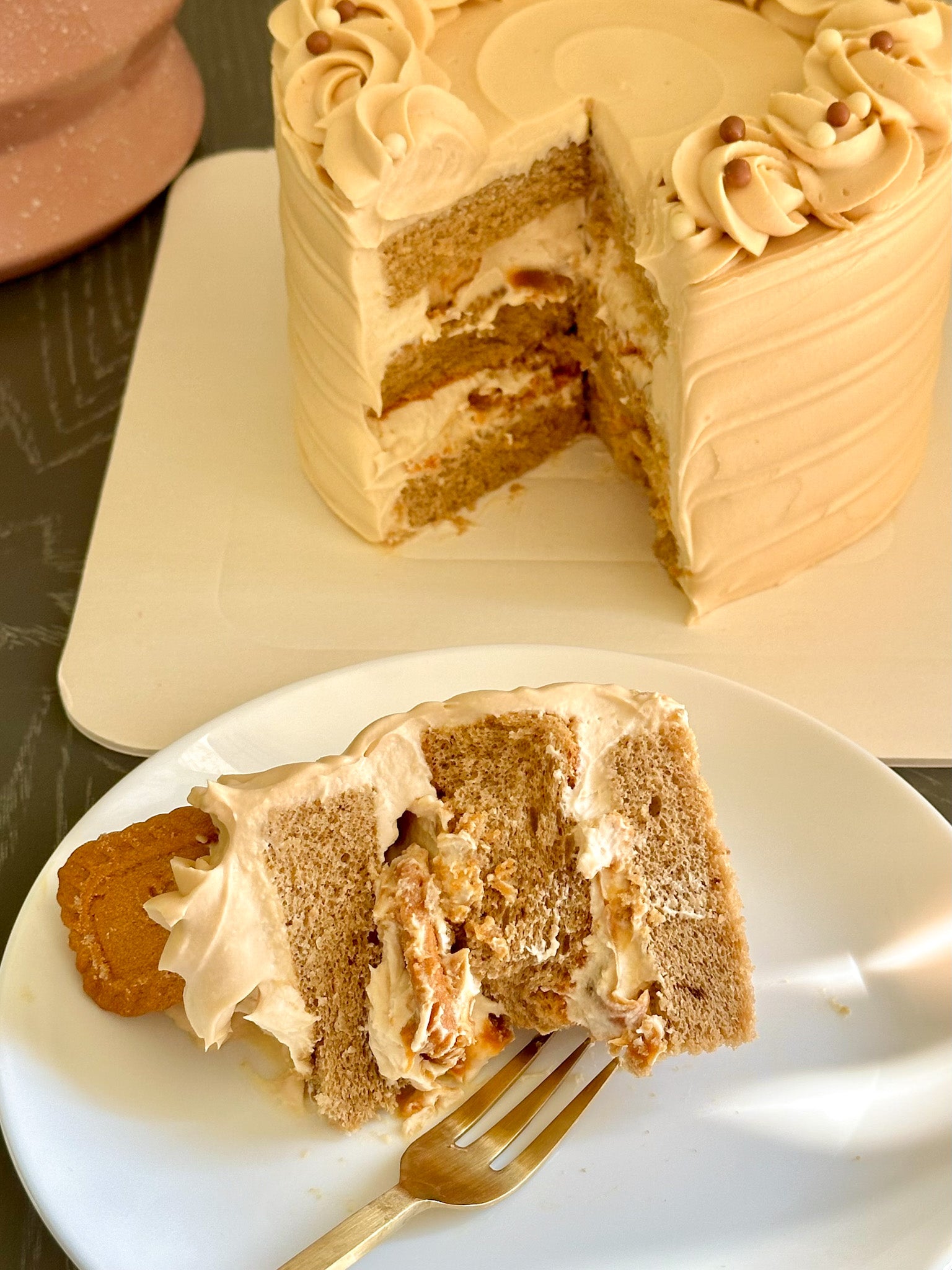Mocha soft chiffon sponge with homemade caramel sauce, Biscoff cookies, and Biscoff caramel cream. Lovers caramelized spices and coffee should give this cake a try!